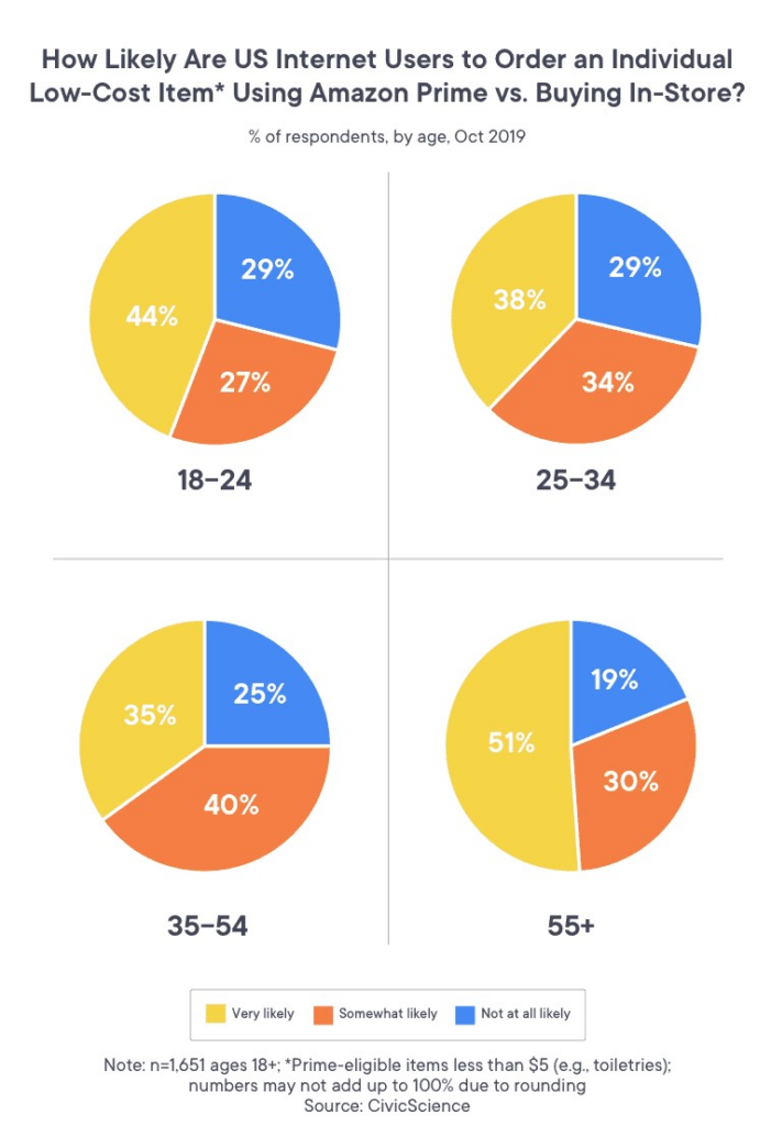 アマゾンには「プライム」があり、イノベーションの面で市場のトップディスラプターの1つになっています。 「1日配送」プランでも「無料配達」でも、Amazonはプロのようにユーザーを魅了し、引き付け続けています。 消費者は、トイレタリーなどの低価格の商品であっても、Amazonで注文することをいとわない。 これがeMarketerによる洞察です。