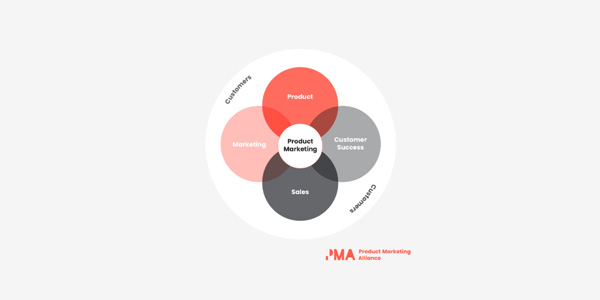 製品マーケティングアライアンスによると、製品マーケティングは、下の図に示すように、製品、マーケティング、販売、および顧客の成功をまとめる組織の中心に位置しています。