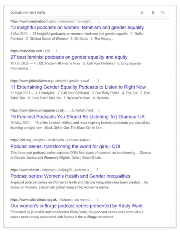 あなたはまだGoogle検索ランキングのためにあなたのポッドキャストを最適化することができます。 ウェブサイトのタイトル、説明、コンテキストなどのポッドキャスト情報の他に、トランスクリプトにキーワードを含めて、検索結果の視認性を高めることもできます。 たとえば、単純な一般的なキーワードの場合:女性の権利に関するポッドキャストは次の結果を表示します。