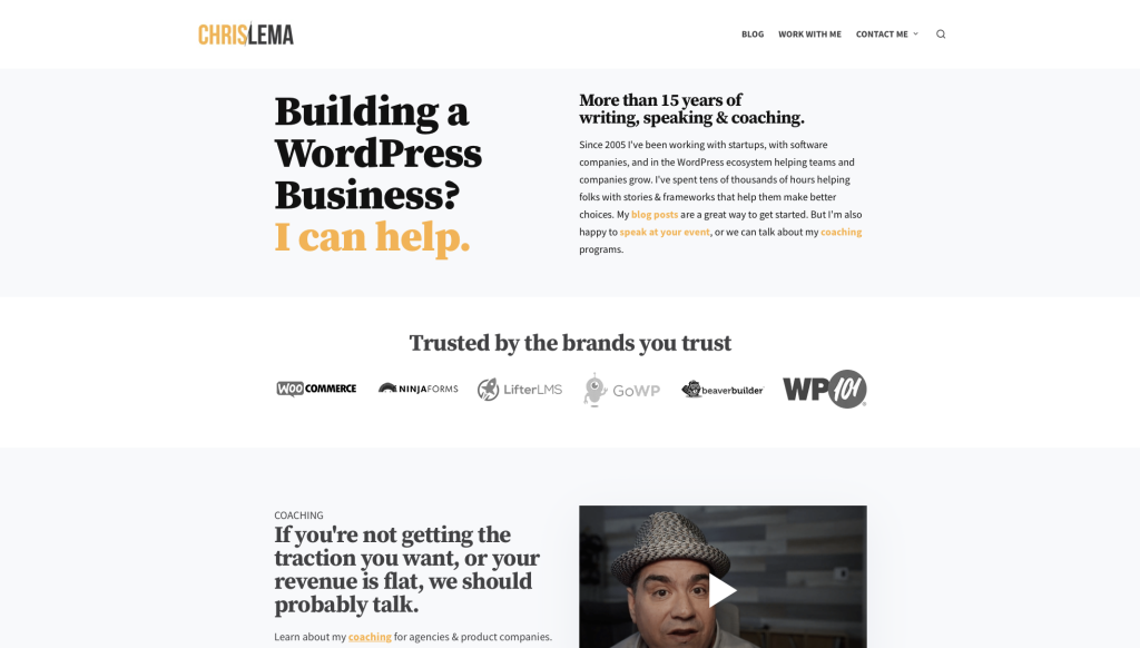 Chris Lema サイトは、適切に設計された WordPress サイトの優れた例です。 目を引くユニークな配色で、全体のデザインはシンプルでありながらモダンです。 空白を使用すると、コンテンツが読みやすく、ナビゲートしやすくなり、画像はテキストを分割して視覚的な興味を引くのに役立ちます。 また、サイトはレスポンシブなので、すべてのデバイスで見栄えがします. Chris Lema は WordPress コミュニティで尊敬されている権威であるため、彼のサイトは一見の価値があります。 記事に加えて、このサイトではコースや電子ブックも提供されているため、WordPress について彼から直接学ぶことができます.