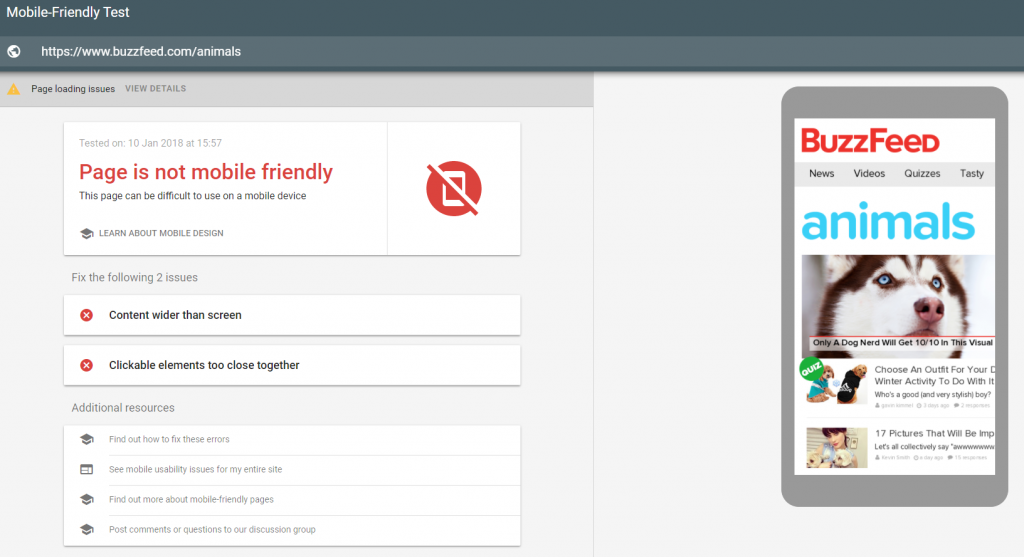ここでは、このページがモバイルフレンドリーではなく、モバイル向けに最適化されていないことがわかります。 Googleは、サイトがモバイルフレンドリーになるように、修正が必要なものと、これらの問題を修正するための追加の学習リソースとリンクを示します。