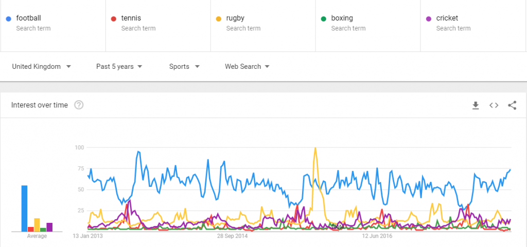 正しく使用すれば、Googleトレンドでは、どのキーワードがいつトレンドになっているのかを確認できます。 これは、オーディエンスをよりよく理解し、どの製品やサービスに関心があるかを理解したいマーケターにとって非常に貴重なツールです。 この例は、過去5年間のさまざまなスポーツに対する英国の関心を示しています。