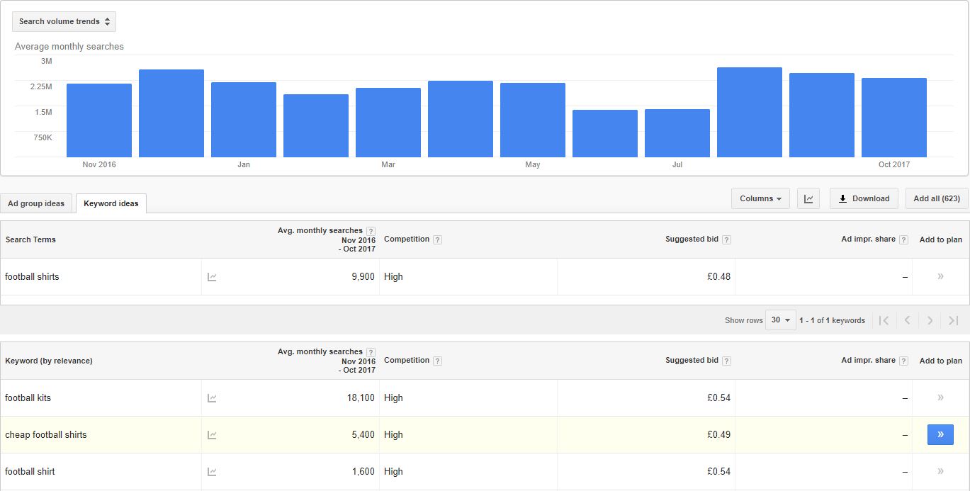 注意事項:Keyword Plannerは、他のキーワード調査ツールと組み合わせて使用する必要があります。 AdWordsアカウントの最低費用のしきい値を満たしていない限り、検索ボリュームの統計情報は調整され、100,000〜100万などの幅広い範囲で表示されます。 したがって、ツールは有料検索を非常に重視しているため、キーワードデータの唯一のソースではありません。