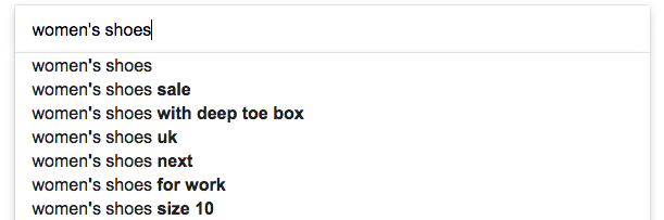 グーグル検索のグーグルインスタント機能は、基本的なキーワード調査ツールとして使用でき、一般的なロングテール検索を提供します。 ここでは、婦人靴に関して最も人気のあるキーワードのいくつかを見ることができます。