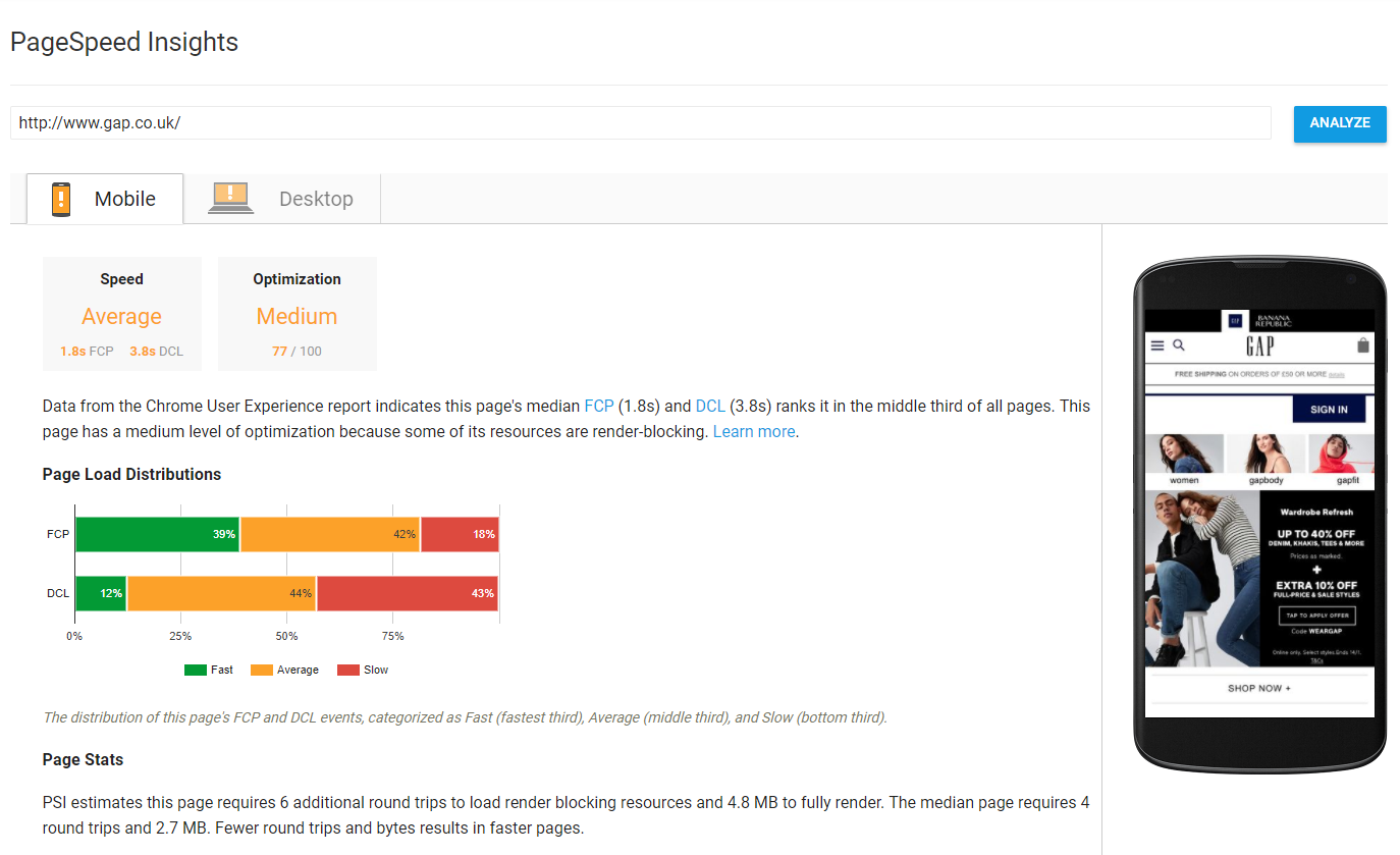 テストを実行するサイトのURLを入力するだけで、モバイルとデスクトップの両方でサイトの速度が遅いか、平均的か、速いかがGoogleから通知されます。 それはあなたに2つの別々の測定基準を与えます: