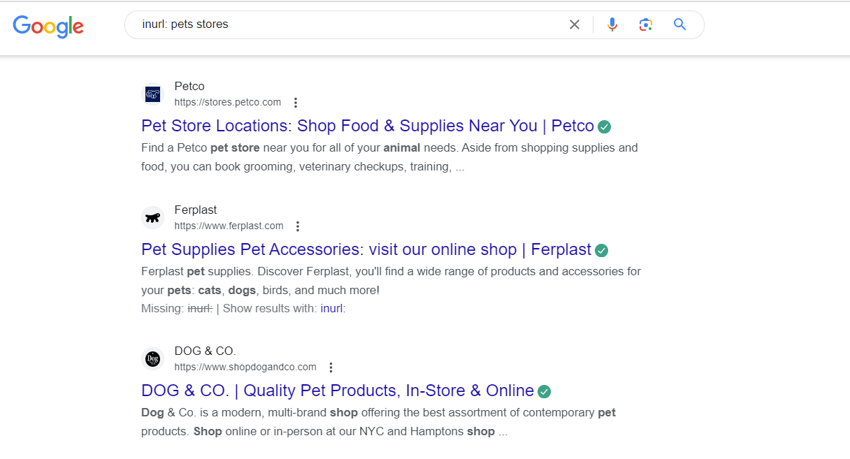 キーワードをより具体的にするには、「inurl:」というフレーズを含めることができます。これにより、キーワードを持つすべての企業がリストされます。 ただし、リストは Shopify ストアのみに限定されないため、結果をフィルターするには別のツールを使用する必要があります。