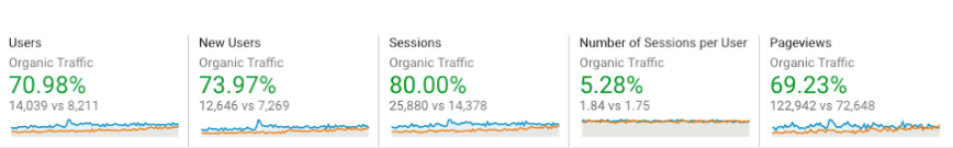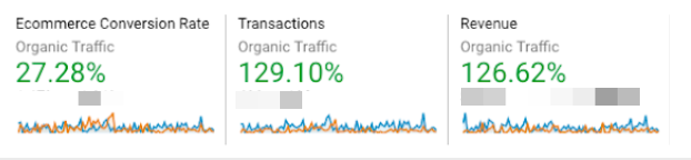 上の図からわかるように、オーガニック トラフィックからのコンバージョン率は 30% 近く上昇し、オーガニック トランザクションは前期から 129% 以上増加しました。 最も重要なことは、コンバージョン数とトランザクション数だけが増加したわけではないということです。 本源的収益も大幅に増加しました。 2 倍以上になり、前の期間から 126.62% 増加しました。 要するに、彼らのウェブサイトへのトラフィックが増加しただけでなく、私たちの SEO 戦略とターゲットを絞ったキーワードの成功を示しただけでなく、より質の高い、より質の高いトラフィックをもたらしました. 彼らのコンバージョン、トランザクション、および売上高はすべて、それを明確に示しています。