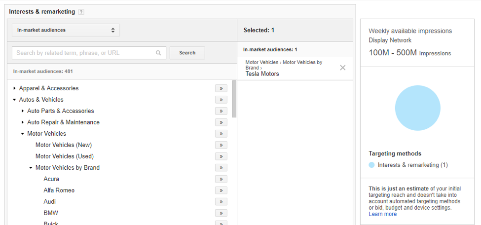 その後、いくつかの広範で詳細な関心と行動を選択できるようになります。 たとえば、「自動車」のように幅広いオーディエンスをターゲットにすることも、「テスラモーターズ」などの特定のブランドのように深く掘り下げることもできます。