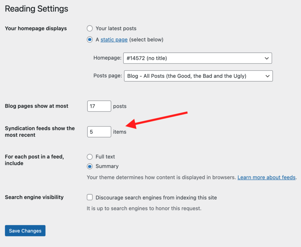 これを行うには、[設定] => [読み取り] に移動し、[シンジケーション料金は最新のものを表示] フィールドに、次のように無限スクロールの投稿数を制限する数を入力します。