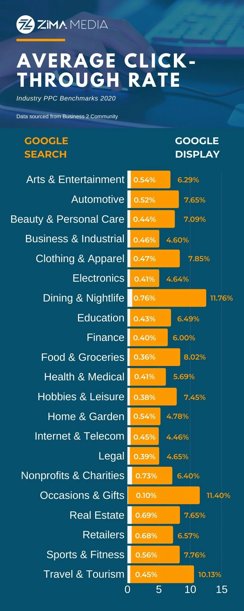 また、業種によってCTRが異なることを覚えておく必要があります。 だから、ここに業界ごとの最新のクリック率の統計があります。