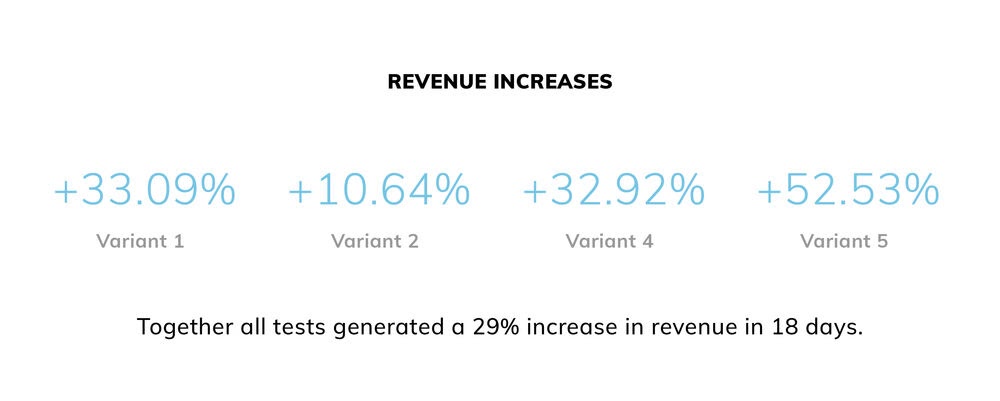 組み合わせたすべてのバリアントの合計結果は、18日間で29%の収益の増加でした。 これらの種類の成長数は、停止する価値があります。CROは冗談ではありません。 これらの高いコンバージョン率のために、クライアントは4分の1以上の売り上げの急増を経験し、バウンス率は大幅に低下しました。 最も重要なことは、KOIOは現在、将来の収益を最大化するために使用する確かなデータに基づいた明確なゲームプランを持っていることです。