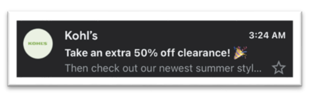Brand Indicators for Message Identification (BIMI) はまだ要件ではありませんが、メールボックス プロバイダーと受信者の両方で期待されるようになる可能性があります。 BIMI についてすべてを確認する必要がある場合は、この概要を確認してください。 Kohl's がここで行っているように、BIMI ロゴを使用して別のブランド ID を提供し、購読者との信頼を育みます。