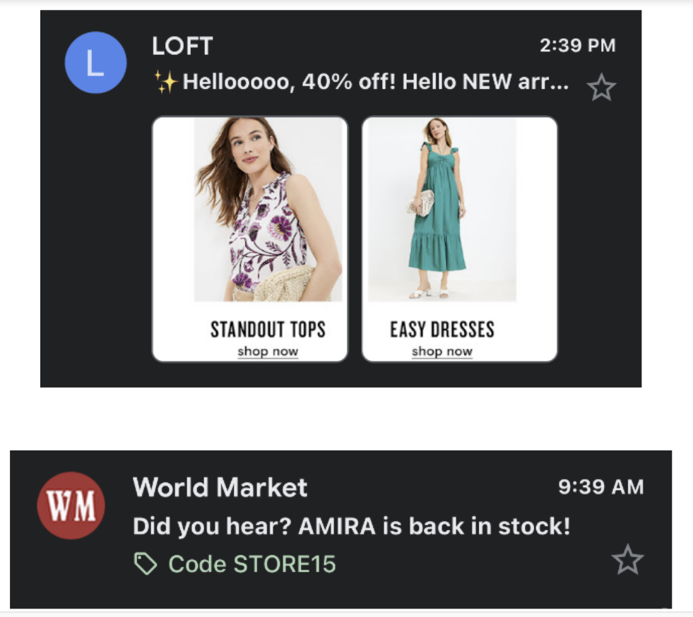 Gmail では、封筒内の画像や売上をキャンペーンから直接強調表示する機能を提供します。 注釈は、モバイル デバイス、特に [プロモーション] タブに画像カルーセルと割引コードを表示するために使用されます ([プロモーション] タブは敵ではないことを忘れないでください!)。開始方法については、こちらをご覧ください。