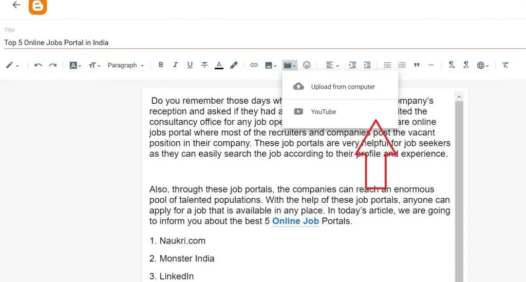 - 提供されたコンポーザ ツールバーを使用して、ビデオの挿入アイコンを選択します。