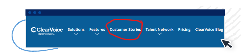 サイトに専用のケース スタディ ページがない場合は、追加することを検討してください。 ベテランの B2B バイヤーは、実際のユースケースにすぐに向かうことを知っています。 ClearVoice では、ケース スタディ (「カスタマー ストーリー」と呼んでいます) が上部のナビゲーション バーに表示されます。