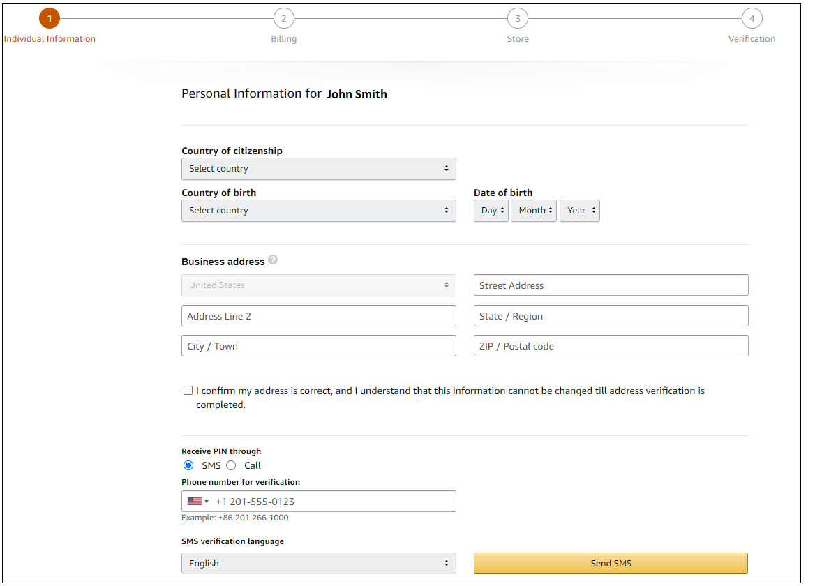 次のページで、Amazonはあなたの会社の住所と電話番号を確認するように求めます。