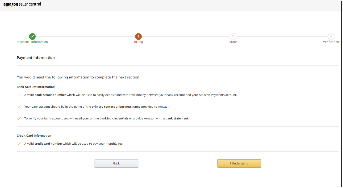 これらの質問を熟考したら、Amazonセラーアカウントを作成する準備ができたら、次の情報を利用できることを確認する必要があります。