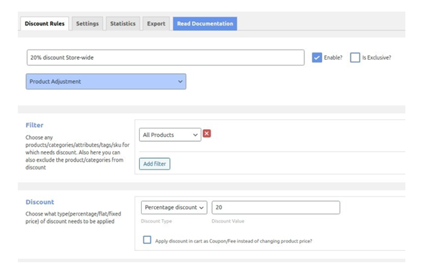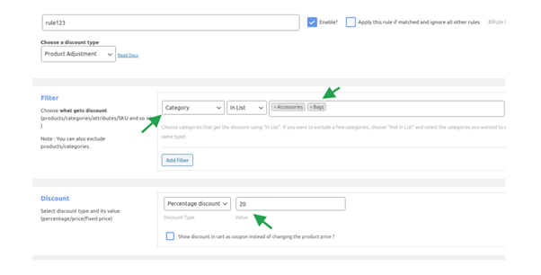 WooCommerceストアの特定のカテゴリでフラッシュセールを提供するたびに、この割引ルールを作成できます。 例えば: