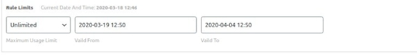 [ルール]セクションで、[有効開始日]フィールドと[有効終了日]フィールドに値を入力して、フラッシュセール期間を設定します。