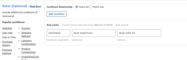 [ルール]セクションで、[ルールの有効開始日]フィールドと[ルールの有効終了日]フィールドを設定して、フラッシュセール期間を定義します。
