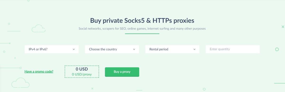 SEO用のスクレーパー、インターネットサーフィン、オンラインゲーム、ソーシャルネットワークなど、さまざまな目的でプライベートHTTPおよびSocks5プロキシをProxy-Sellerから購入します。 1Gb / sのインターネットチャネル速度を提供し、400を超えるネットワークと800の異なるサブネットからプロキシを選択します。