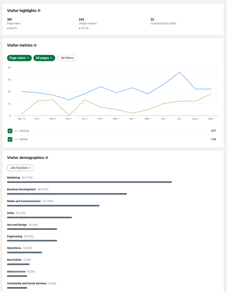 また、特定の期間のトラフィック統計を表示するトラフィック セクションを注意深く監視する必要があります。 これにより、ページ ビュー数やユニーク ユーザー数など、より多くの指標にアクセスできます。 また、人口統計に基づいて、会社のページを閲覧する人々についてさらに視覚化することもできます。 場所、会社の規模、業界、勤続年数に応じて検索モデルをフィルタリングできることに注意してください。