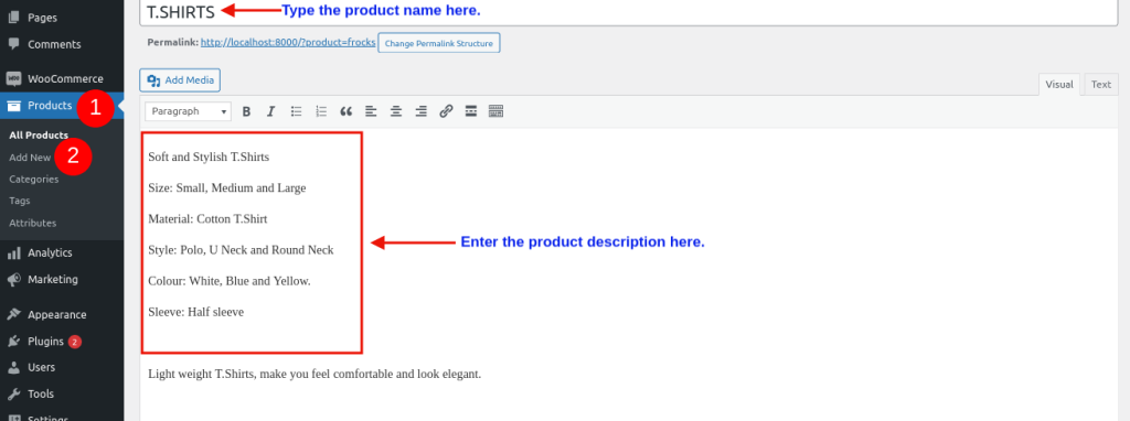 - WordPress ダッシュボード -> 製品 -> 新規追加 に移動します。 [新しい製品の追加] ページで製品名と製品の説明を入力します。
