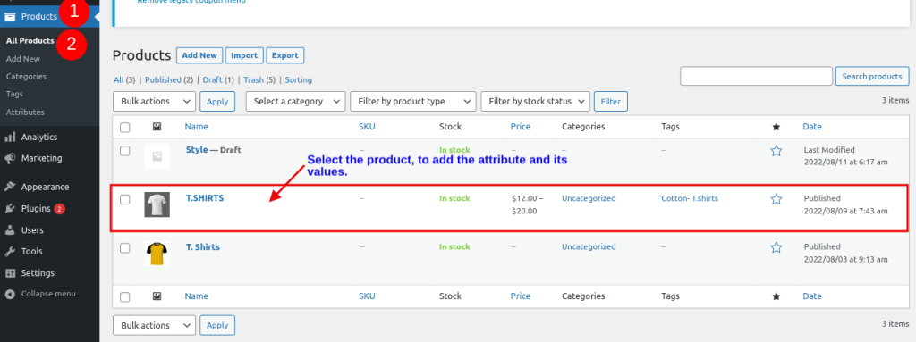 次に、作成した属性と値を製品に追加します。 以下の手順に従って、属性とその値を商品に追加します。