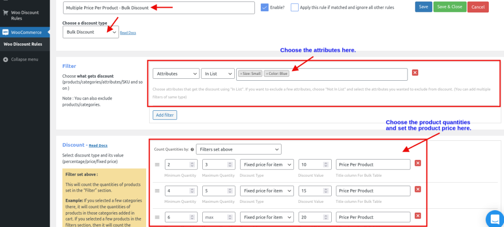 WooCommerce -> Woo 割引ルール -> 新しいルールの追加に移動します。 バンドル割引またはバルク割引タイプのいずれかを選択できます。 したがって、その製品の価格は、顧客が選択した数量に基づいて動的に更新されます。