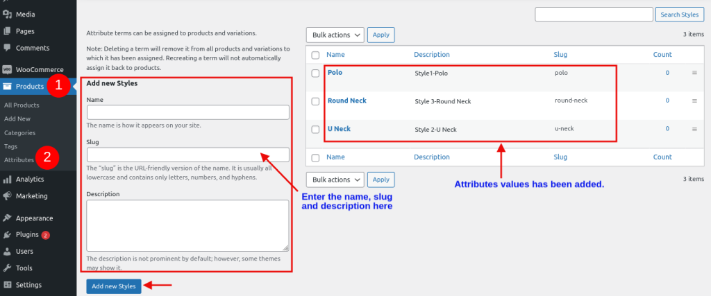 - WordPress ダッシュボード -> 製品 -> 属性に移動します。