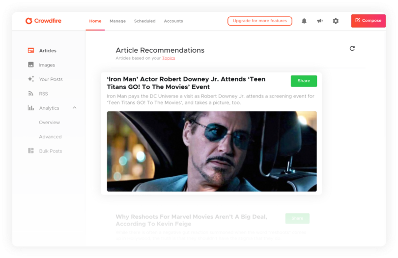 Crowdfire を使用すると、キュレートされたコンテンツを見つけ、投稿をスケジュールし、視聴者と関わり、分析を深く掘り下げ、カスタム レポートを作成できます。 無料でお試しください。