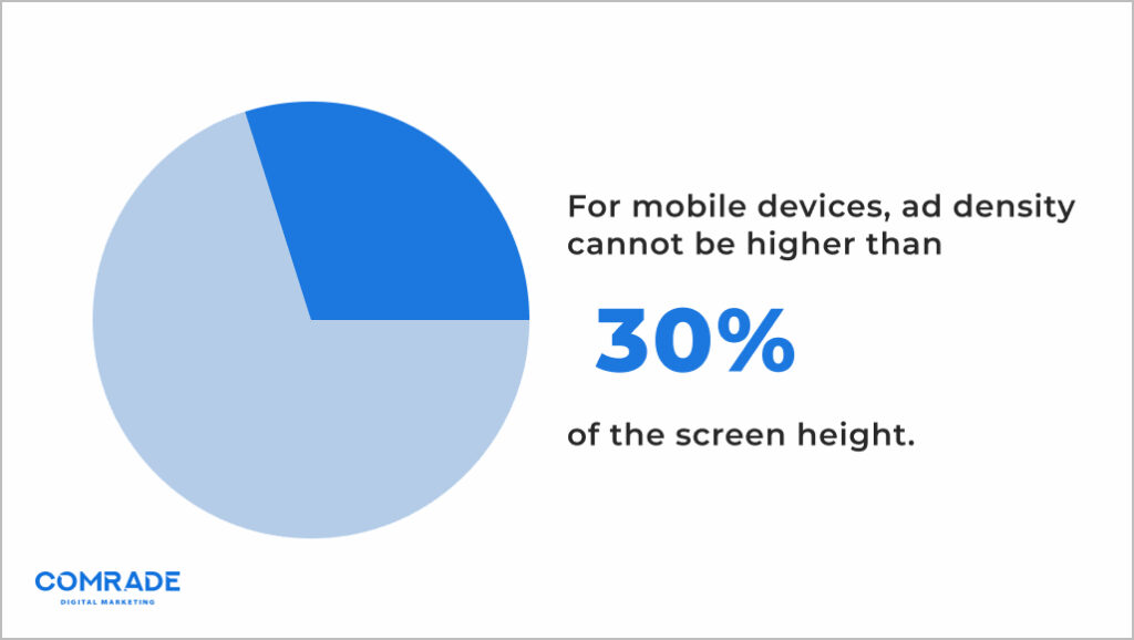 「広告密度は、モバイル ページのメイン コンテンツ部分内のすべての広告の高さを合計し、ページのメイン コンテンツ部分の高さの合計で割ることによって決定されます。 モバイル デバイスの場合、広告密度は 30% を超えることはできません。 つまり、ページの縦方向の高さの 30% 以上を占める広告は押し付けがましいものです。」