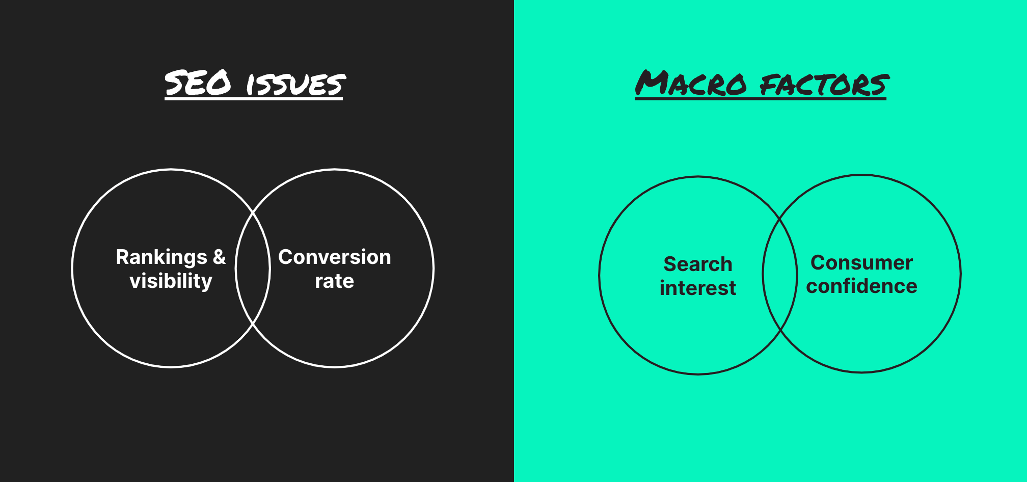 オーガニック パフォーマンスの低下の 2 つの潜在的な原因は、外部市場要因またはオーガニック ウェブサイト パフォーマンス(SEO) の問題です。