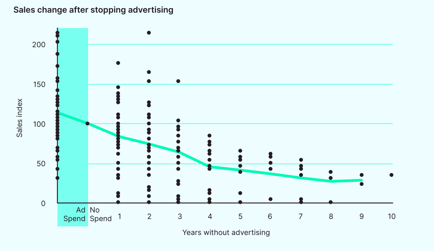 例えば。 マーケティング投資を一時停止したブランドは、売上が長期的に減少し、マーケティングへの投資を再開したときに追いつくのが難しくなることが示されています。