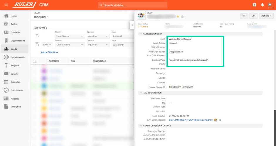 Rulerからのデータを適用すると、このリードはオーガニック検索を完了した後に変換され、HubSpotリードトラッキングに関するブログで変換されたことがわかります。