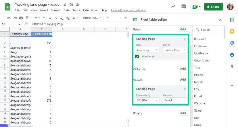 ピボットテーブルを作成し、[行] >[ランディングページ]>[昇順]を選択します。