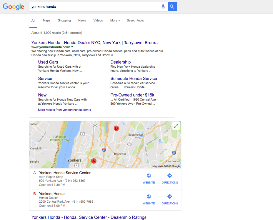 地域で「ヨンカーズホンダ」を検索したところ、地域のナレッジパネルは表示されていませんでした。 Googleはまた、主要な自動車販売店の上に「サービスセンター」の地図リストを表示しました。 彼らの主な販売店はほとんどの検索者に見つけてもらいたい場所であり、その場所には100以上の肯定的なレビューがあったため、これは問題でした。