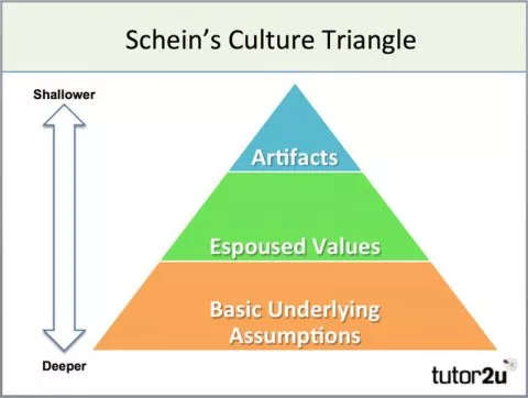 シェインによれば、文化は3つのレベルで存在します。表面レベルの「アーティファクト」(観察可能な行動とシンボル)、アーティファクトの下(支持された価値観と文化的規範)、そして最深層には、広く共有され、無意識の基本的な仮定があります。