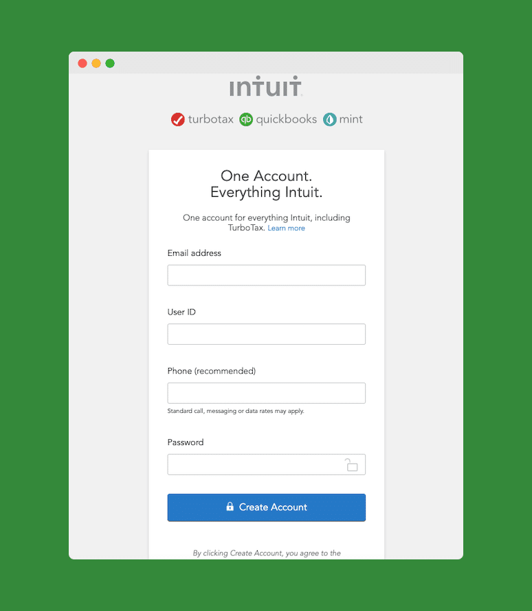 その後、Intuit で TurboTax アカウントを作成するよう求められます。 Quickbooks または Mint の Intuit アカウントを既にお持ちの場合は、同じログインを使用して、すべてのサービスに対して 1 つのアカウントを持つことができます。