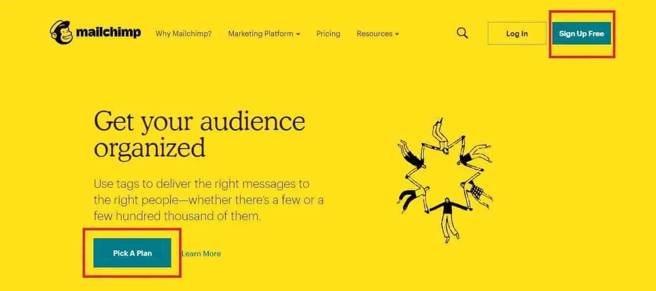 サイト内をできるだけスムーズに移動できるようにサイトを構成する必要があります。 顧客になるプロセスをできるだけ簡単にしたいと考えています。 明確な行動を促すフレーズ (CTA) をコンテンツ マーケティング戦略に組み込むと、これに役立ちます。 以下の Mailchimp Web サイトの例を見てみましょう。