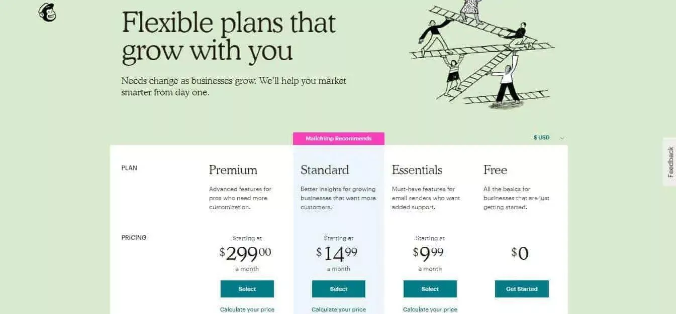 メール マーケティング ソフトウェア プラットフォームであるMailchimp が良い例です。 彼らのソフトウェアは、ユーザーにさまざまな機能を提供します。 ただし、選択できる個別のプランは 4 つだけで、それぞれに明確な価値提案があります。 見込み客は、それぞれが提供するものを見て、その中から選択することができます。ビジネスの多くのことと同様に、物事をシンプルに保つことは利益をもたらします.