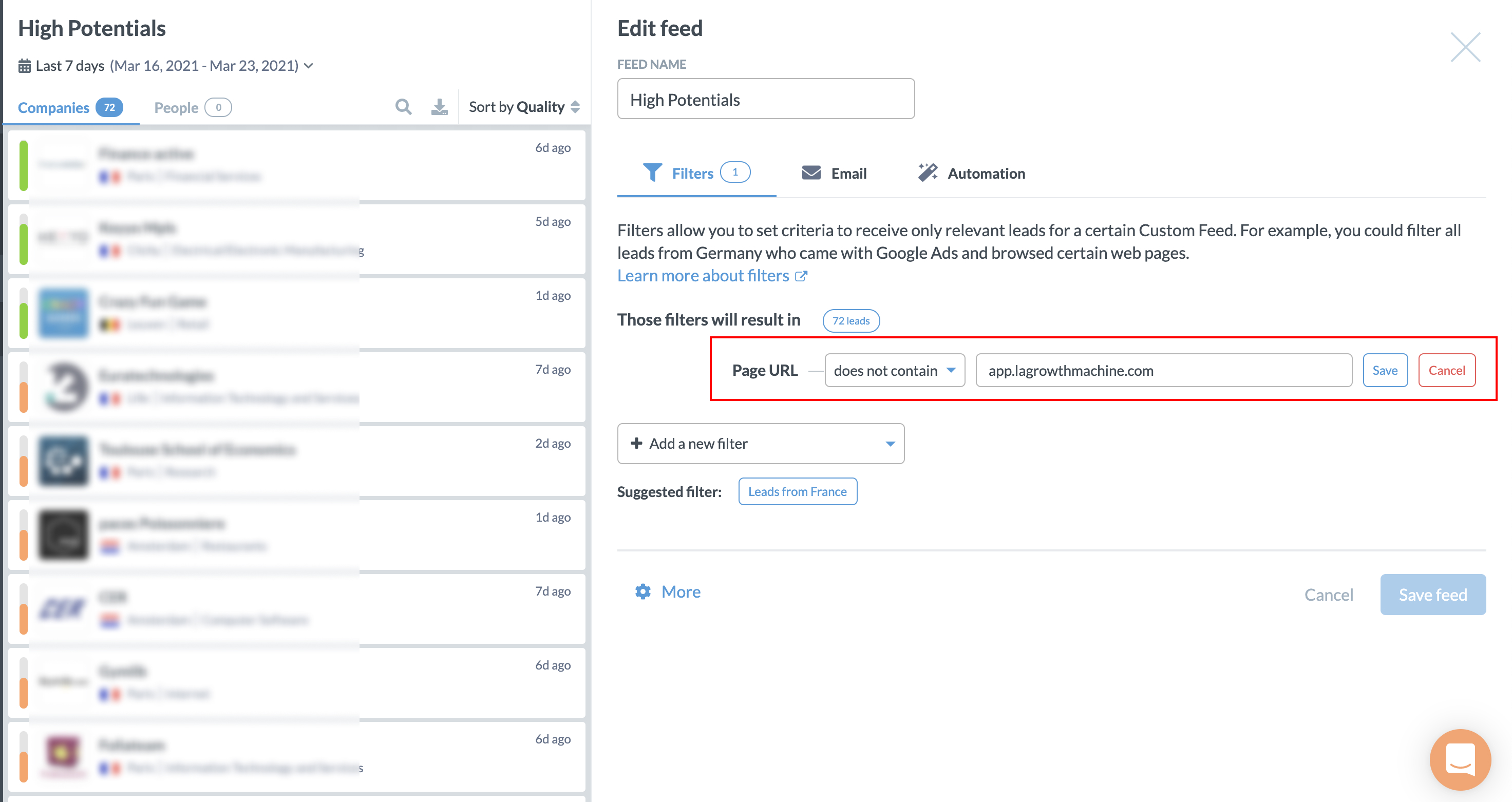 - ペルソナ基準に対するリードの関連性を詳細に示す、ホバーオーバー分析情報を含む動的なリストを作成します。