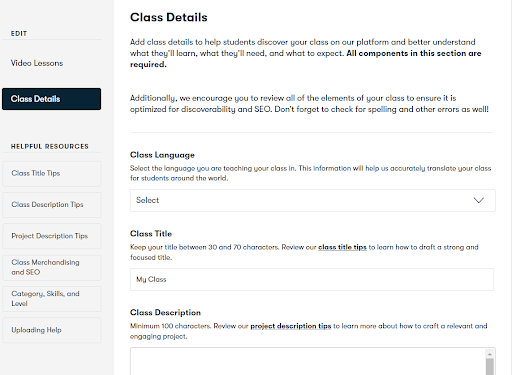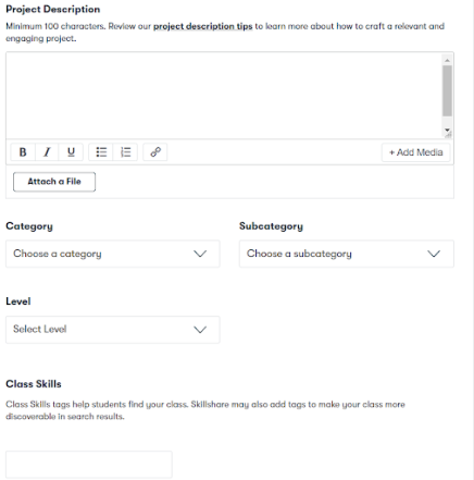 ドロップダウンメニューを使用して、クラスカテゴリとサブカテゴリを入力し、適切なレベル(初級、中級、上級、またはすべて)を指定して、クラススキルタグを入力します。 すべてのフィールドに入力したら、クラス情報を保存します。
