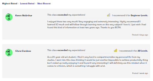 おそらく少なくとも一握りのレビューを読む必要がありますが、Skillshareはデフォルトでそれらを最良から最悪にソートすることに注意してください。 レビューをよりバランスよく表示するには、「最新」で並べ替えた方がよい場合があります。