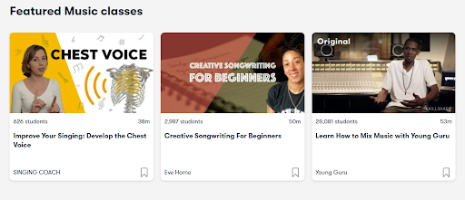 そして、これら2つの検索方法を組み合わせることができます。 たとえば、音楽のクラスを受講したいとします。 [作成]カテゴリのサブカテゴリ[音楽]をクリックして、[注目]、[人気]、および[トレンド]の音楽クラスを参照できます。