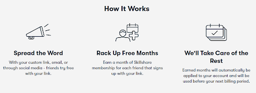 10.紹介プログラムで無料の月を獲得する: Skillshareは、メンバー向けの紹介プログラムも提供しています。 Skillshare Premiumメンバーの場合は、友人や家族にPremiumを紹介できます。 あなたの友人は彼らの1ヶ月の無料トライアルにサインアップします。 その後、有料のプレミアムメンバーシップに移行すると、1か月間無料になります。 獲得した月は自動的にアカウントに適用され、次の請求期間の前に使用されます。 さて、それは甘い取引です!