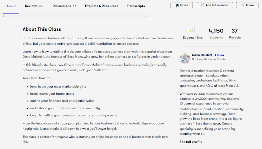 この画面には、難易度(初級から上級)、クラスを受講した生徒の数、クラスのレビュー、ディスカッション、クラスプロジェクトの説明へのリンクなど、クラスに関するその他の情報も表示されます。他の読み物やワークブックなどのリソースへのリンク。