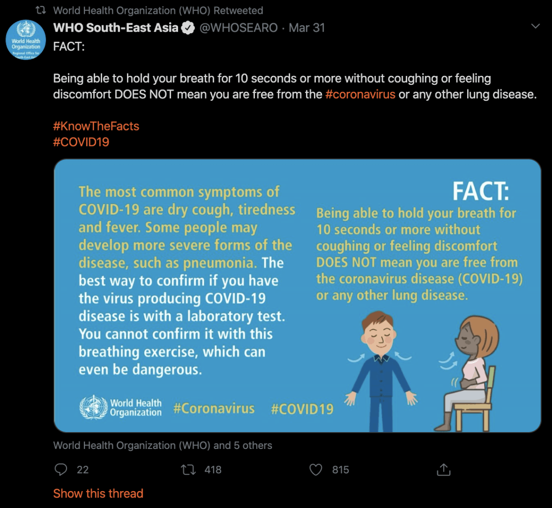 可能であれば、特に健康情報を共有したり、健康行動を促進したりする場合は、信頼できる情報源、公開された調査研究、または評判の良いニュース組織を引用してください。 覚えておいてください:人々は、新たに出現する健康問題に関する信頼できる情報を求めて健康組織に目を向けています。