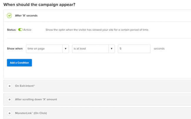 リードキャプチャフォームを作成した後、もう1つの重要な考慮事項はターゲティングです。 幸い、OptinMonsterを使用すると、一定期間後、終了意図、ページの一部を下にスクロールした後、または特定の時間にフォームを表示するように設定できます。 同様に、オプトインフォームを表示できる訪問者を指定するオプションがあります。