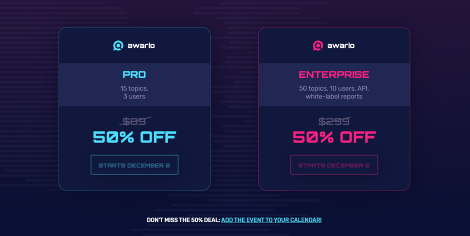ただし、11月26日から12月3日のブラックフライデーとサイバーマンデーの場合、AwarioはProプランとEnterpriseプランの50%割引を提供しています。 これは、月額サブスクリプションでも年額サブスクリプションでも適用されます。